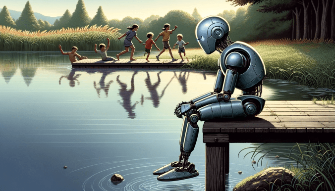 It had been many weeks since Marvin had come down to watch them play in the pond. They splashed water at each other and played underwater games as the android looked on from its position at the edge of the dock. Its mechanical legs swung slightly over the water as it sat there.